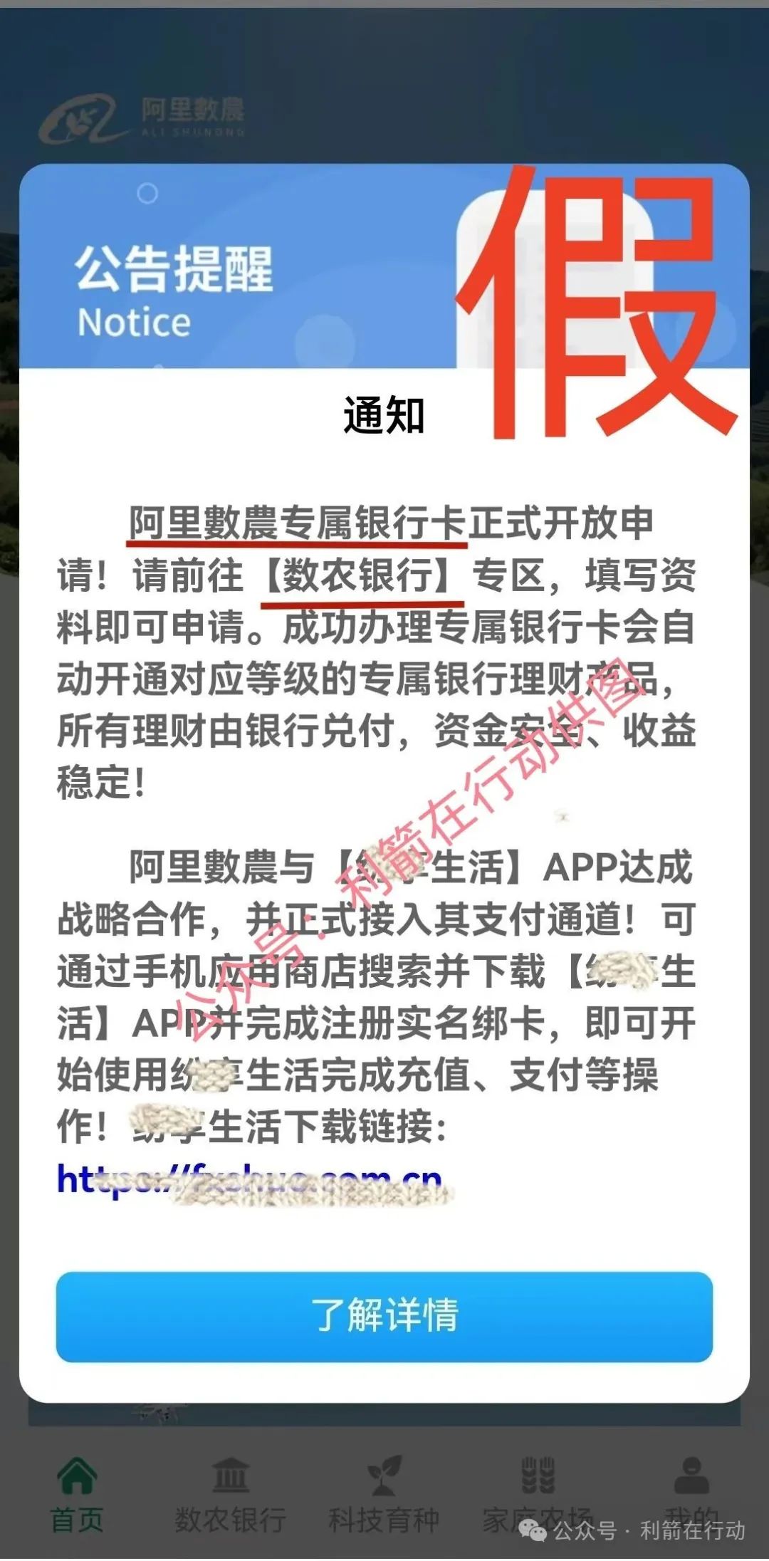 所谓 “阿里数农专属银行卡”“数农银行” 的通知纯属虚构。稍有常识的人都该自问:现实中根本不存在 “数农银行”,这分明是凭空杜撰!通知中还宣称与 “某某生活” APP 达成合作并开通支付通道,此类常规合作却被大肆宣传,显然是故弄玄虚、掩人耳目。