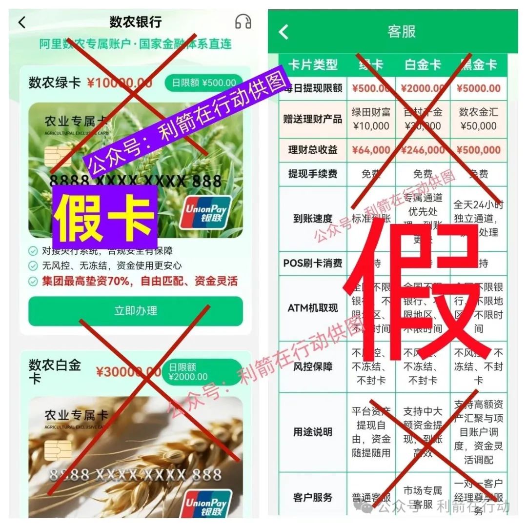 虚构的 “数农银行” 中推出的 “数农绿卡”“数农白金卡”“数农黑金卡”,号称 “白送钱”“白送理财产品” 还能提现,这般天上掉馅饼的好事,显然是糊弄人的诈骗道具。