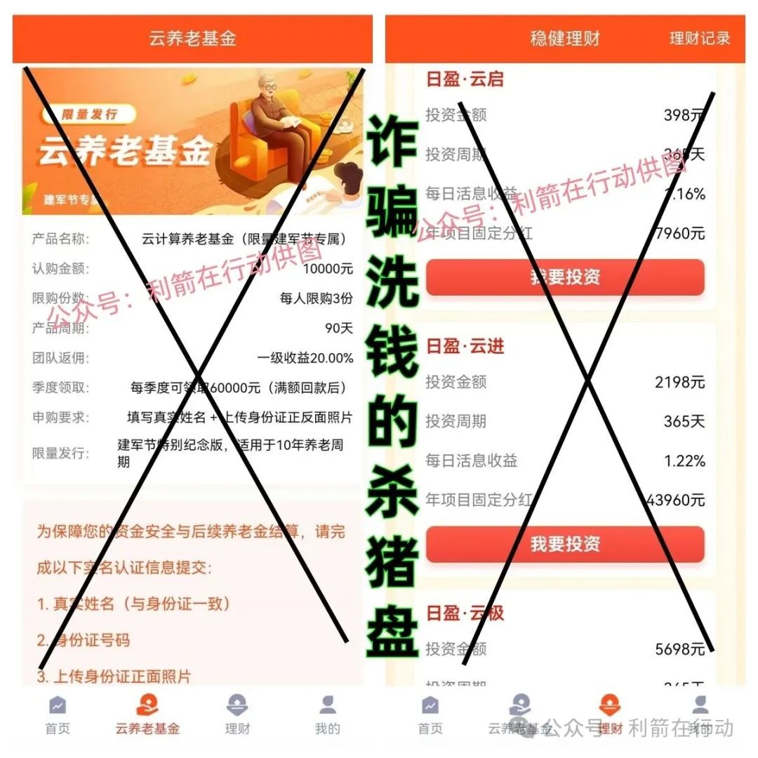 :推出 “云养老基金”“稳健理财” 两个投资产品,看似 “低风险高回报”,实则是让受害人持续交钱的 “杀猪盘”。