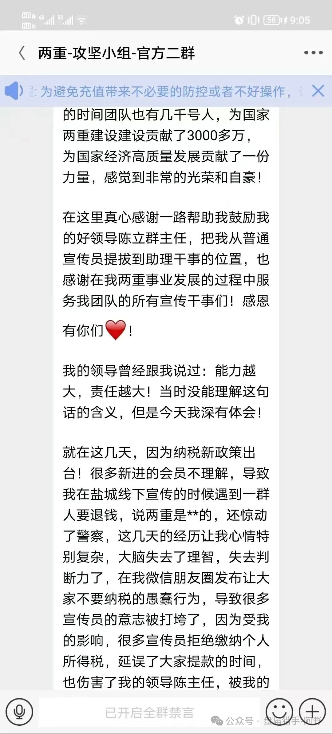 魏俊梅在“两重 - 攻坚小组 - 官方二群” 里演 “道歉信” 苦情戏!先说自己 “为国家贡献” 被误解,后装可怜称 “失去理智误导别纳税”,本质就是拖延时间、继续收割!等你发现提现不到账、账户冻结(平台说冻就冻 ),她就躲起来装死,把受害者当傻子耍!