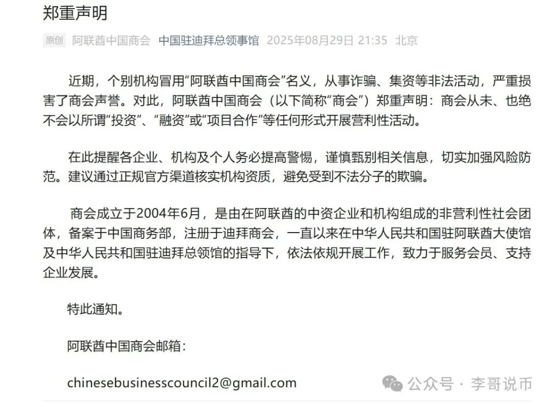 中国驻迪拜总领事馆与阿联酋中国商会近日发布郑重声明,明确指出个别机构冒用“阿联酋中国商会”名义,从事诈骗、集资等非法活动,严重损害了商会声誉。真正的阿联酋中国商会成立于2004年6月,是在商务部备案的非营利性组织,会员涵盖中石油、华为等200余家中企。