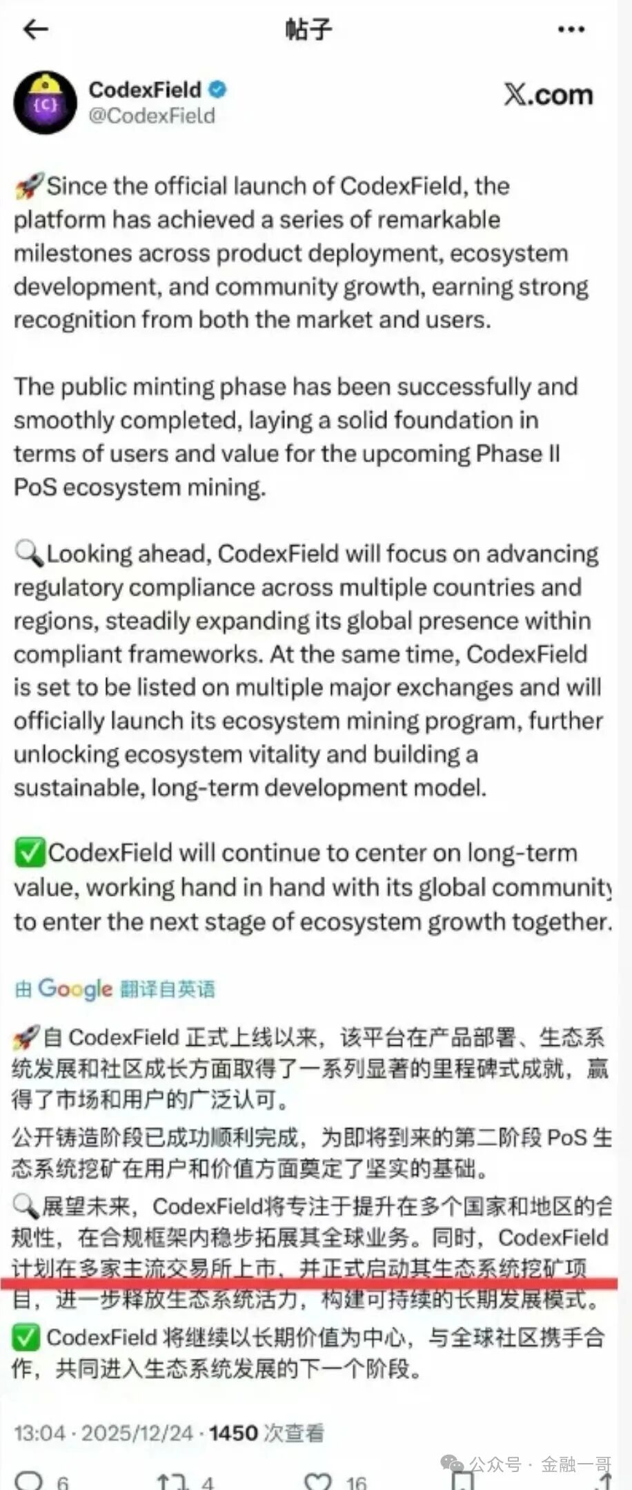 “崩盘跑路”这冰冷的四个字背后,不知承载着多少人的绝望,又让多少家庭陷入困境,难以熬过这个年关。就如 codexfield 这个项目,终究还是没能撑过这个年关。这已然是本月倒闭的众多大型项目之一,由此可见上个月十三部委联合发布公告所产生的巨大影响力。