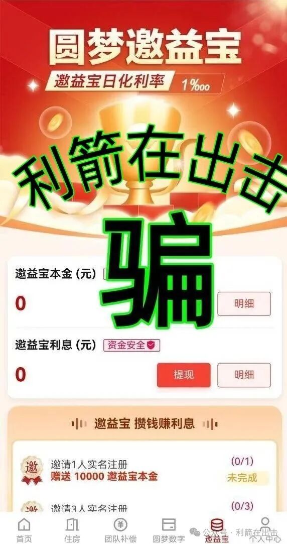 在该APP中有个“圆梦邀益宝”,年化利率是1%,只要在里面交钱,开始给一点甜头,后期就会对所有的资金全部收割。邀请人注册还要给相应的“邀益宝”本金,这些都是给的一串串虚假数字而已,目的是引诱更多人进入这个项目中进行收割。