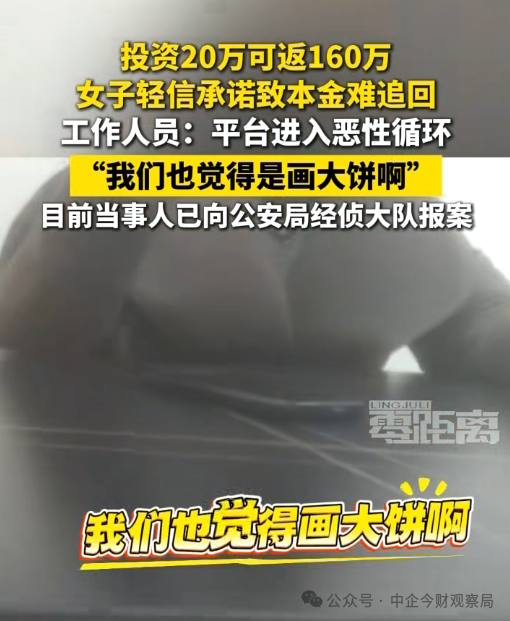 然而,华丽的开场背后,却是一场精心策划的骗局。《零距离》1月10日报道:今年5月,南京市民王女士轻信“华民行数智店商”平台“投20万两个多月赚160万”的高额回报承诺,投入23万元后仅收回8万元,平台随后以运营问题为由停止兑付。王女士称,像她这样的受害者并非个例。