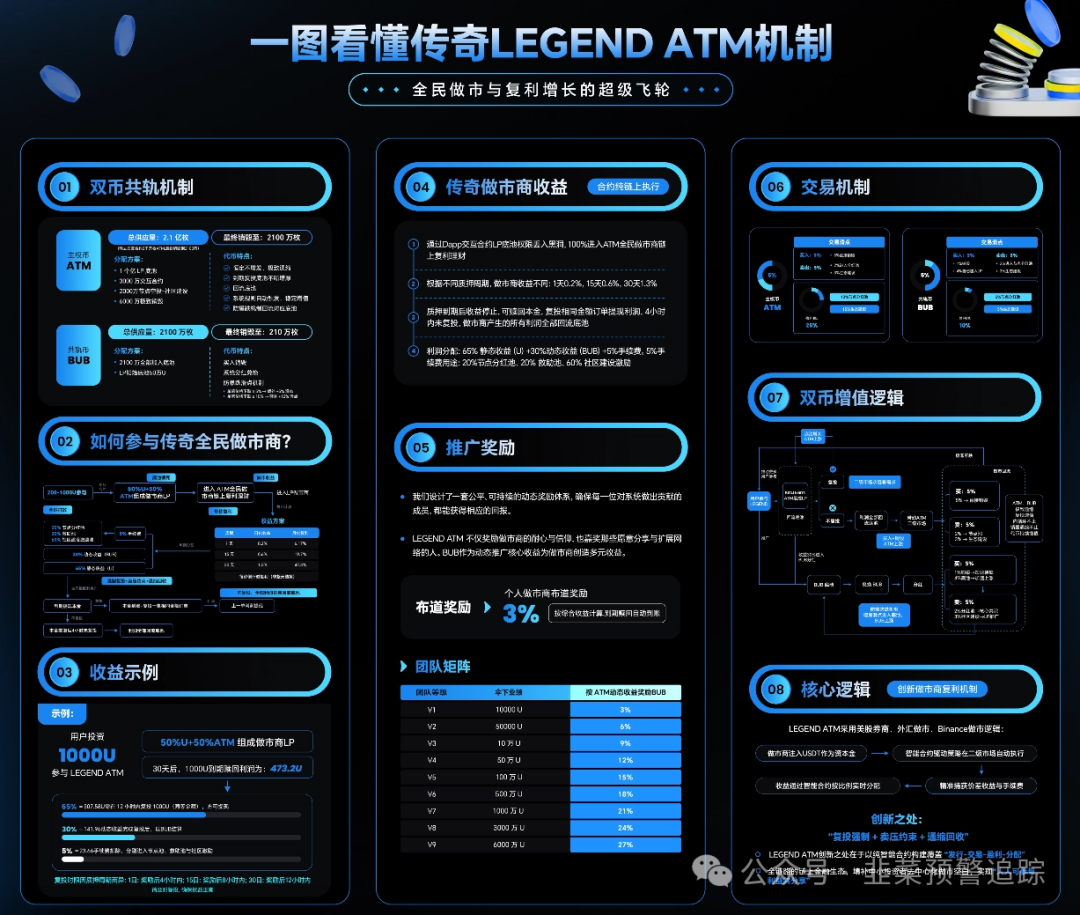传奇LEGEND ATM虽号称是基于区块链的DeFi项目,由拉菲原班团队打造,有双币共轨、强制复投等创新机制,但风险极大。项目方未丢弃权限,可随意调整规则甚至跑路。其承诺的高静态、动态收益违背常理,高收益必然伴随高风险。此类复杂项目很可能是资金盘骗局,大家要充分了解机制,谨慎评估风险,切勿盲目参与,避免遭受财产损失。