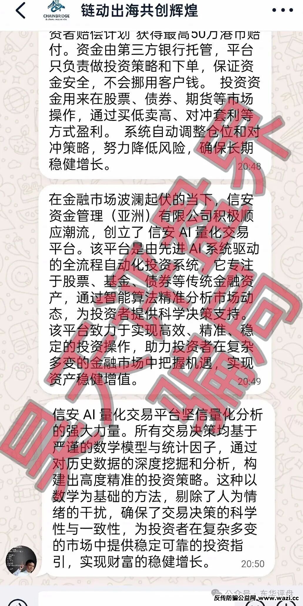 今天昊天带大家曝光一个套牌“美国信安”的ai量化骗局,群里自称叫链动出海联盟,模式就是分红类资金盘骗局,会员投资后日收益高达0.75%—1.5%不等,此盘会员有2万人左右,也已经运行了一年了,涉案资金最少过亿,也是境外柬埔寨园区搞的杀猪盘,据知情人爆料此盘也算是目前为数不多的大盘了,这个盘也是头铁,被套牌的正规公司多次出面打假,此盘还到处开工作室,拉人头填坑,昊天看了一下全网还没有人曝光,今天昊天算第一个曝光的了,模式如下,文章随便举报会曝光到底,高度预警,速度撤离!