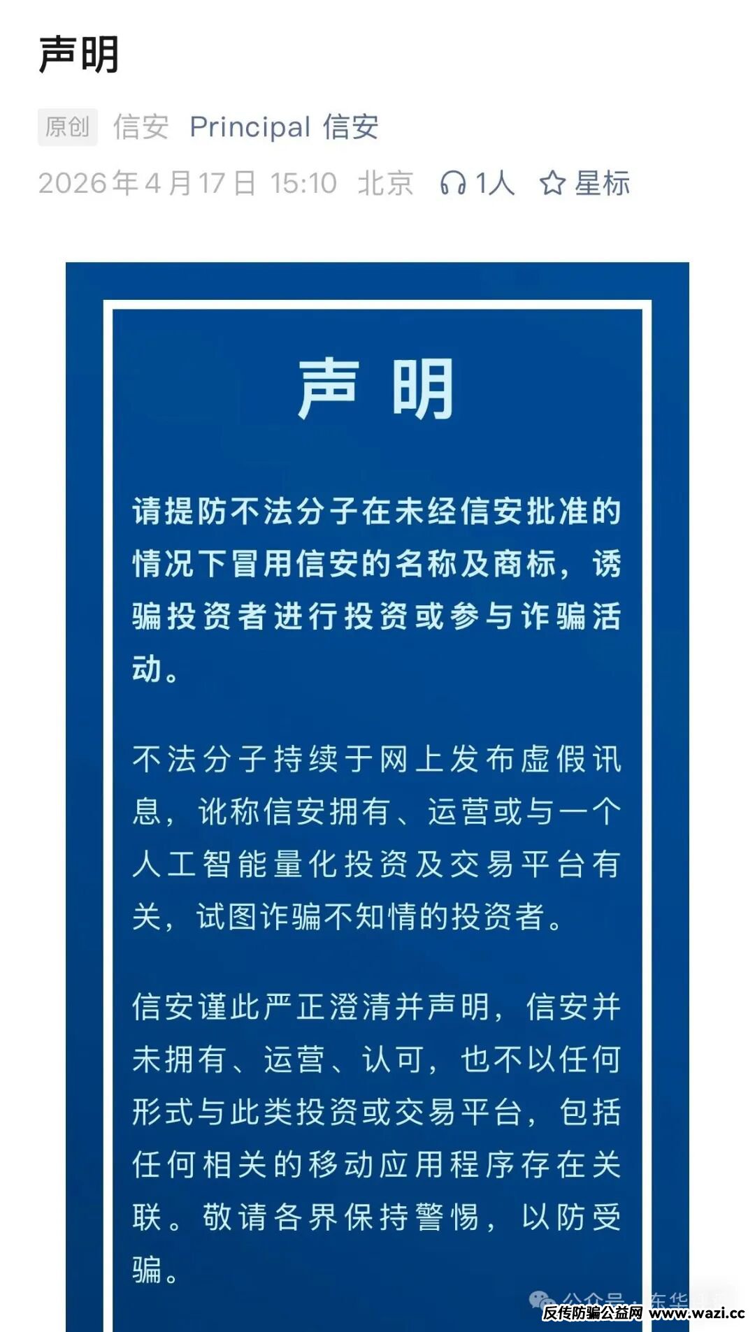 昊天看了一下真正的信安公司去年就出面打假了,前几天又发布了新声明,一共两条打假声明,不信的可以自己去查一下,声明如下: