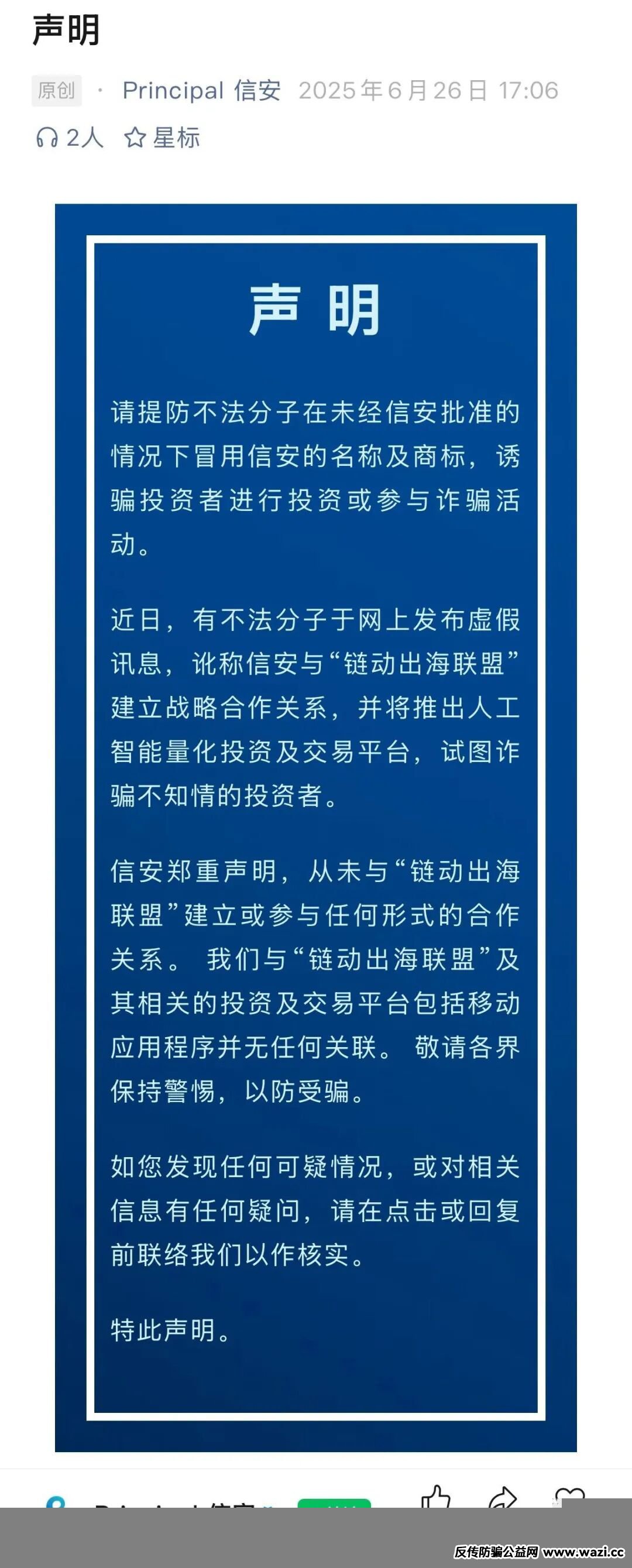 昊天评盘界友情提醒:套牌的“美国信安ai量化”链动出海联盟分红类资金盘骗局,正规公司出面打假,高度预警,速度撤离!近期昊天评盘界发现知乎,小红书,微博,抖音等app都有冒充昊天的诈骗团伙,希望大家记住了昊天评盘界是反诈自媒体账号并不做任何项目,更不会去推广任何项目,除公众号外其他一律不是本人,切勿上当受骗!