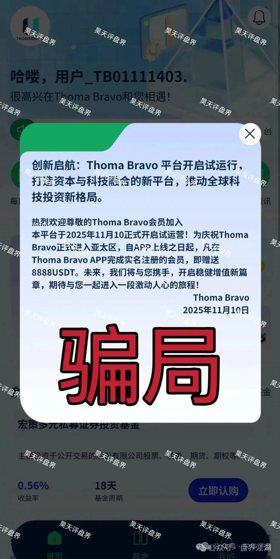 昊天评盘界:近期不少粉丝爆料了一个叫逸行团队Thoma Bravo的分红类资金盘骗局,昊天看了一下,此盘有两个app,一个叫“逸行团队”app,一个叫“Thoma Bravo”app,群聊叫“TB基金项目”群,此盘宣称是2025年11月10日开盘的,到目前为止也快半年了,打着“理财”的旗号,要求大家通过来路不明的链接下载陌生人软件,套取用户信息,并且APP未通过ICP备案,服务器也在国外,这个项目根本没有任何真实的盈利业务,都是用后面进场投资者的钱给前面的人发收益,是典型的“拆东墙补西墙”庞氏骗局,只要新资金一断,大家投进去的钱很可能直接打水漂。昨日不少受害者反馈骗子开始大量单割会员,只要你提现就给你封号,很明显泡沫大了,高度预警,马上崩盘跑路!