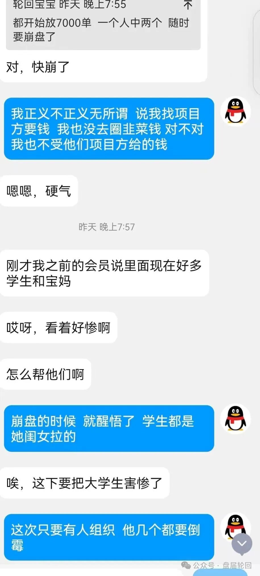 这应该就是这个诈骗团伙的聊天记录,这种盘还想开一年 简直是笑话。他们的合伙人直接说 能开三个月 就万幸了,直接疯狂拉人进 直接收割 这就是他们的初心。毕竟他们之前开的盘 都是一个月之内割完就跑 。快割 短命 已经是他们的代名词。