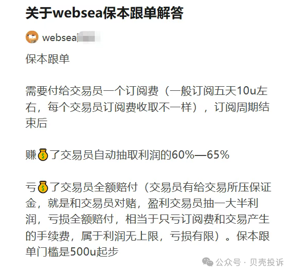 很多人直到账户无法登录,都不知道自己玩的是什么。Websea的核心套路,是它推出一款叫做“合约保本跟单/合约保险”的产品。简单来说,就是让你跟着所谓的大神去开单,如果你亏了,平台会用保险节点的收益来赔付你的本金。