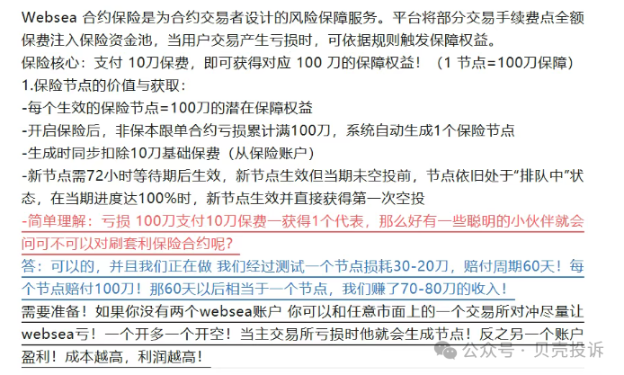 这是Websea崩盘最大的机制漏洞。大量老玩家根本不做单,全是“对刷”。怎么玩?你自己多开两个号,或者跟着团队搞,同时间一个账号开多,另一个账号开空。在真实的合约市场里,一边爆仓另一边能翻倍;但在Websea,行情涨跌跟你没关系,交易本身不赚钱,但你亏损的那个账号会获得保险节点赔付。赔付给你的钱,加上那点带单员交的保证金,在成百上千倍的套利资金面前,简直是杯水车薪。